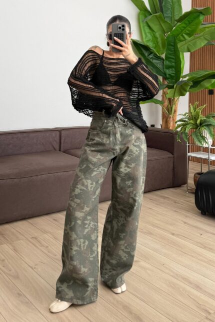 Asker Desenli Beli Bağlamalı Jean