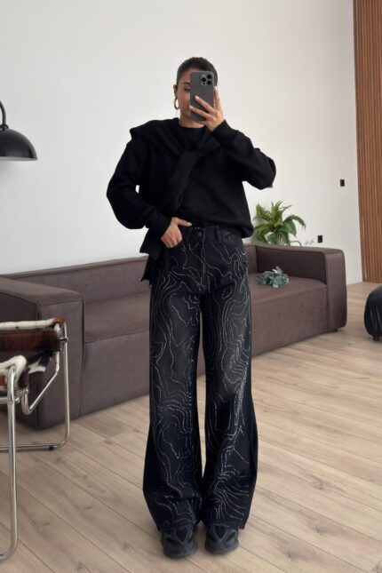 Işıltılı Wide Leg Siyah Eskitme Jean