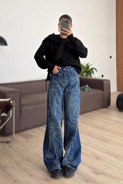 Dalgalı Taşlı Geniş Paça Mavi Jean