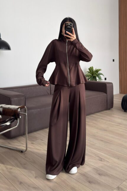 Pantolonu Pileli Bol Paça Hırka Takım Kahverengi