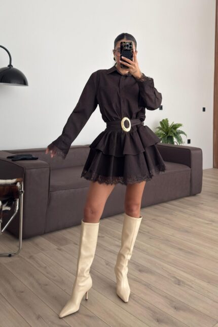 Güpür Detaylı Gold Tokalı Kahverengi Elbise