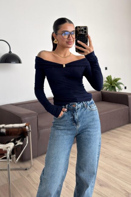 Gold Tokalı Madonna Yaka Bluz Lacivert