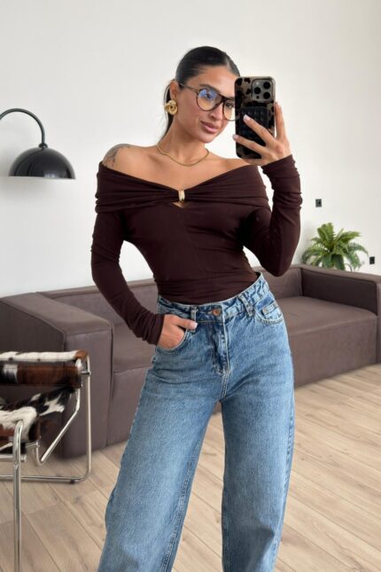 Gold Tokalı Madonna Yaka Bluz Kahverengi