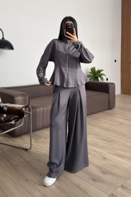 Pantolonu Pileli Bol Paça Hırka Takım Antrasit