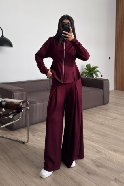 Pantolonu Pileli Bol Paça Hırka Takım Bordo
