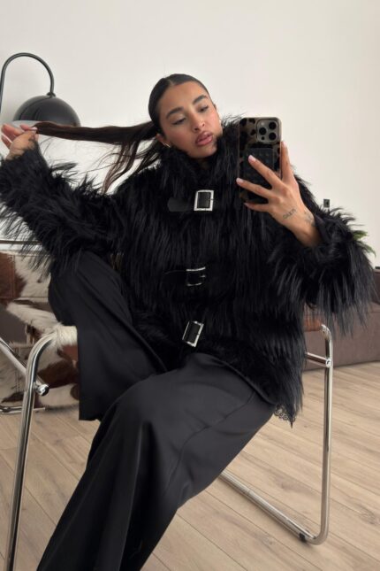 Kemer Detaylı Sakallı Kısa Kürk Siyah