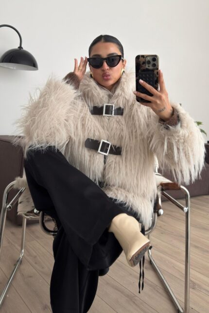 Kemer Detaylı Sakallı Kısa Kürk Ekru