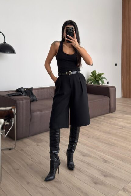 Beli Kemerli İspanyol Paça Kumaş Pantolon Siyah