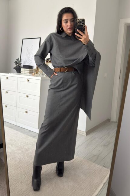 Manşet Kol Yakası Şallı Gömlek Etek Takım Antrasit