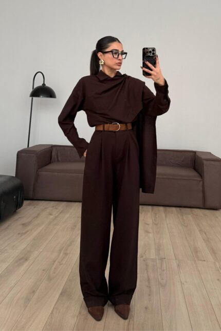 Manşet Kol Yakası Şallı Gömlek Takım Acı Kahve