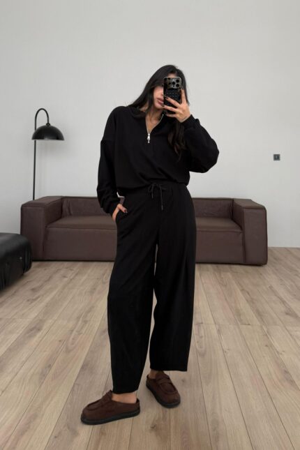 Yakası Fermuarlı Triko Takım Siyah