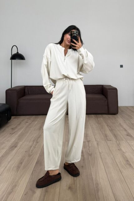 Yakası Fermuarlı Triko Takım Ekru