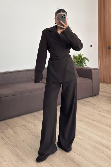 Kolları Volanlı V Yaka Pantolon Takım Kahverengi