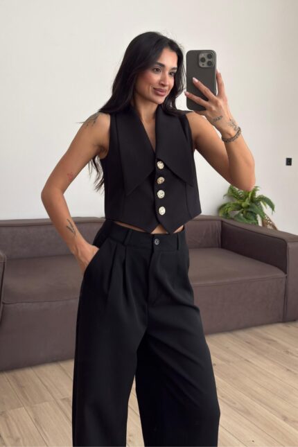 Kolları Volanlı V Yaka Pantolon Takım Siyah