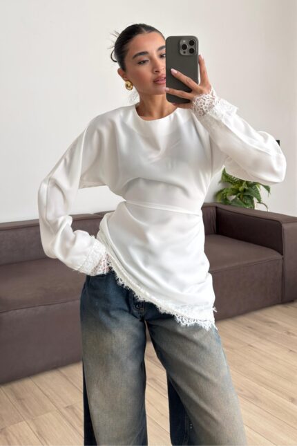 Askılı Dantel Detaylı Saten Bluz Taş