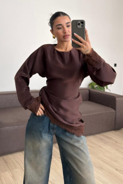 Askılı Dantel Detaylı Saten Bluz Kahverengi