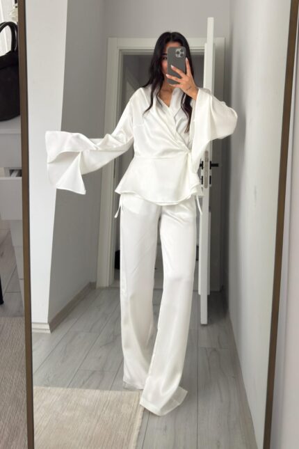 Kolları Volanlı V Yaka Pantolon Takım Haki