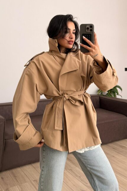 Kalın Kemerli Atlas Ceket Kahverengi