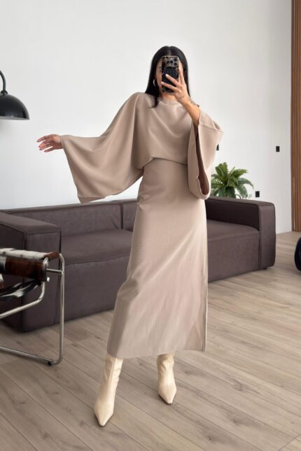 Massi Geniş Kollu Belden Bağlamalı Elbise Taş