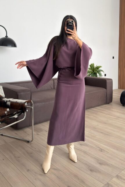 Massi Geniş Kollu Belden Bağlamalı Elbise Mürdüm