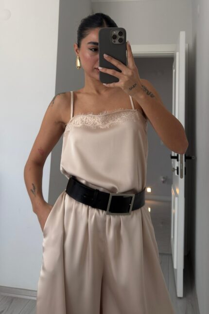 Yakası Pileli Boğazlı Saten Bluz Camel