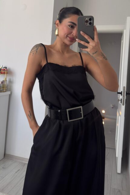 Yakası Pileli Boğazlı Saten Bluz Siyah