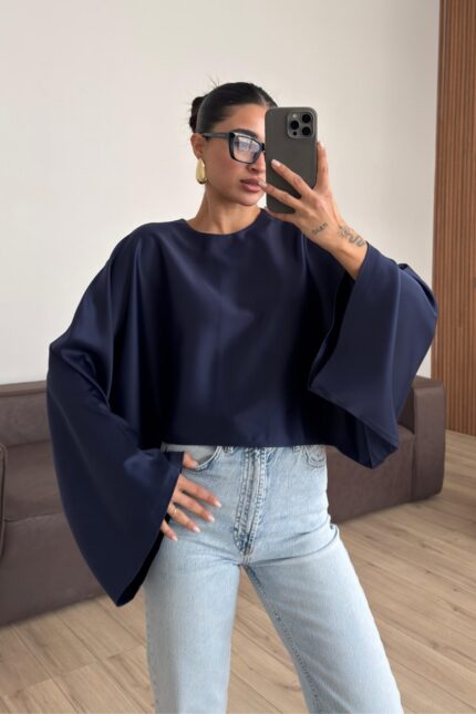 Yarasa Kol Saten Bluz Lacivert