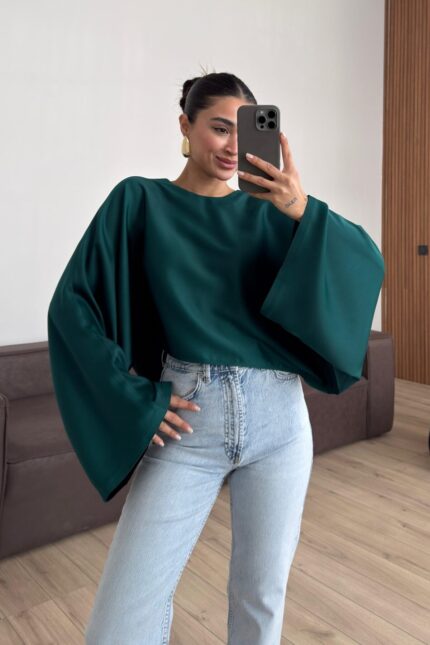 Yarasa Kol Saten Bluz Zümrüt