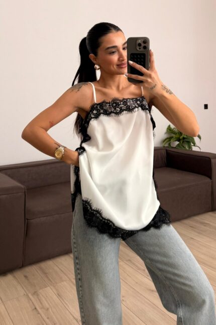 Askılı Dantel Detaylı Bluz Beyaz