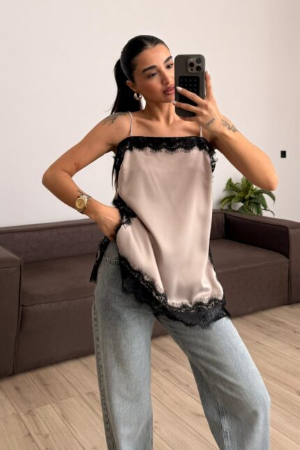 Askılı Dantel Detaylı Bluz Vizon