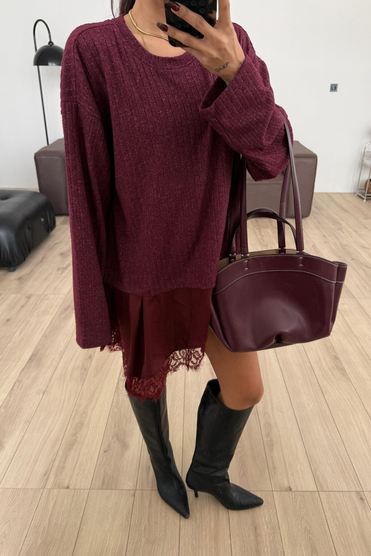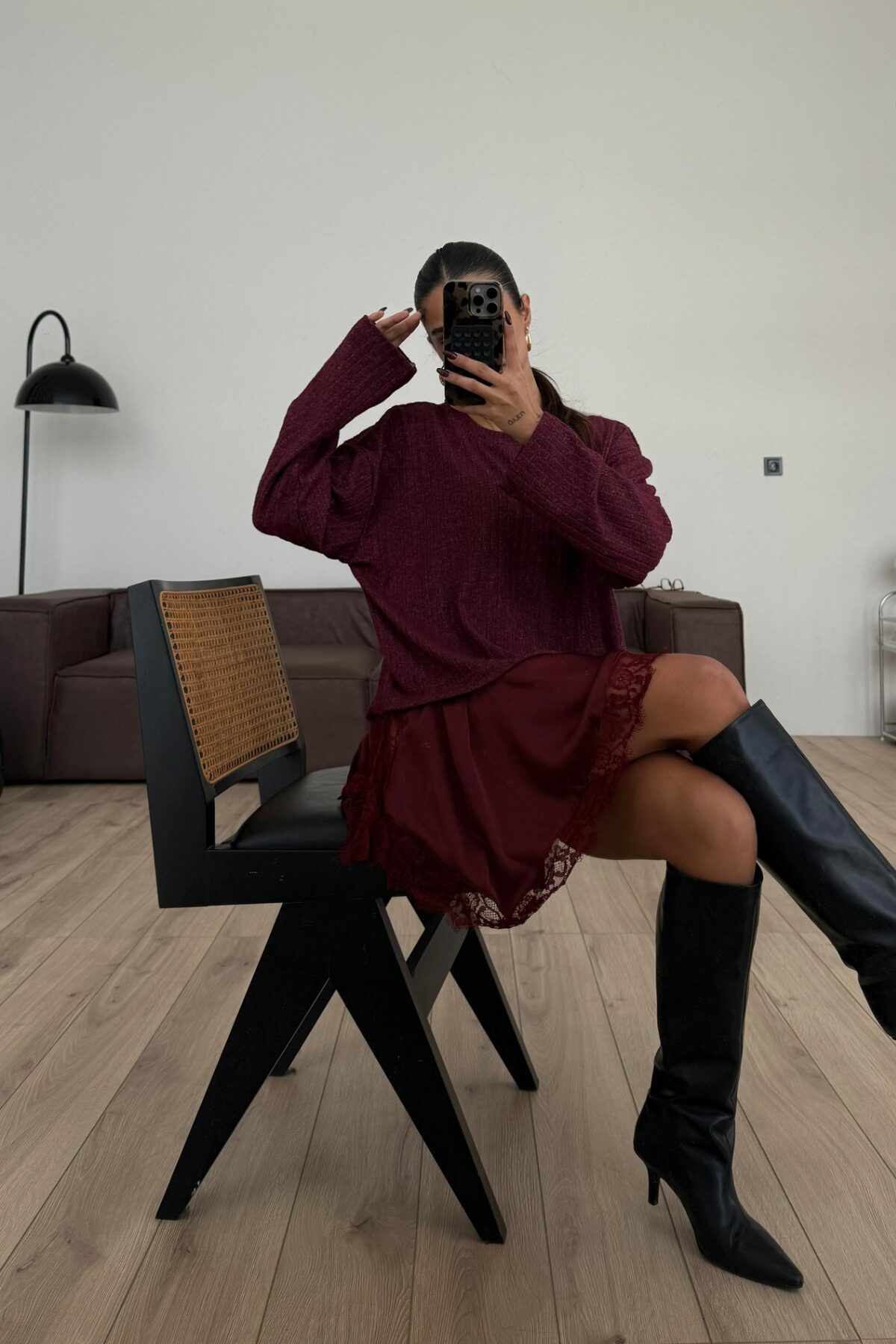 Asimetrik Kesim Güpürlü Bluz Bordo