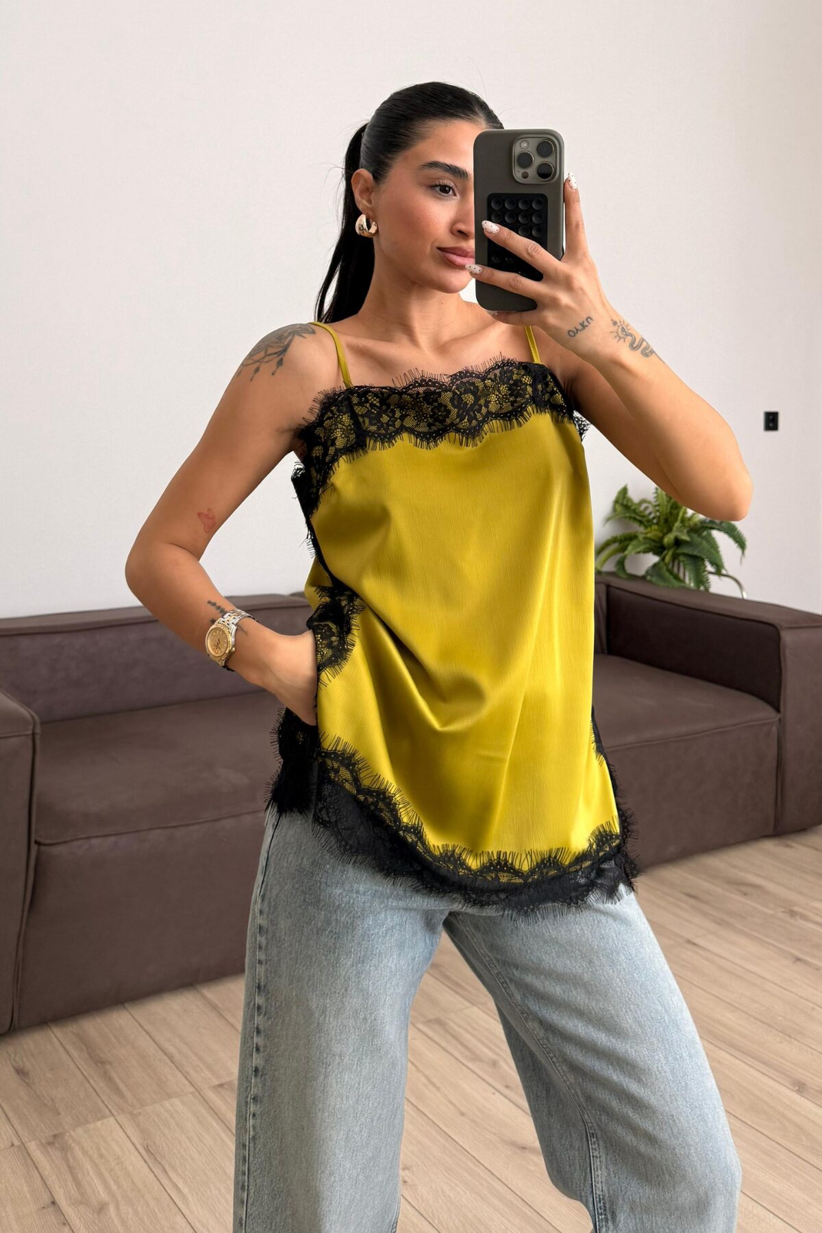 Askılı Dantel Detaylı Bluz Yağ Yeşil
