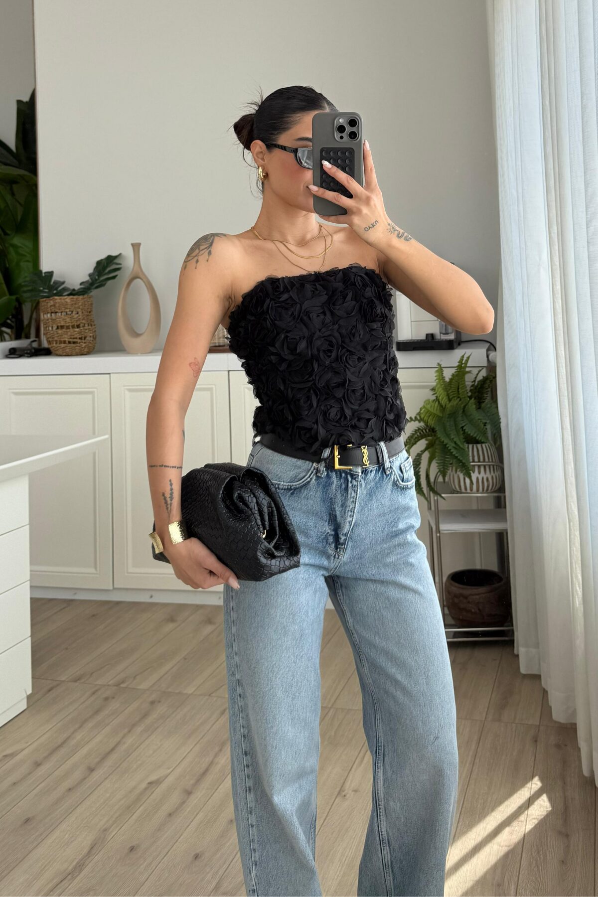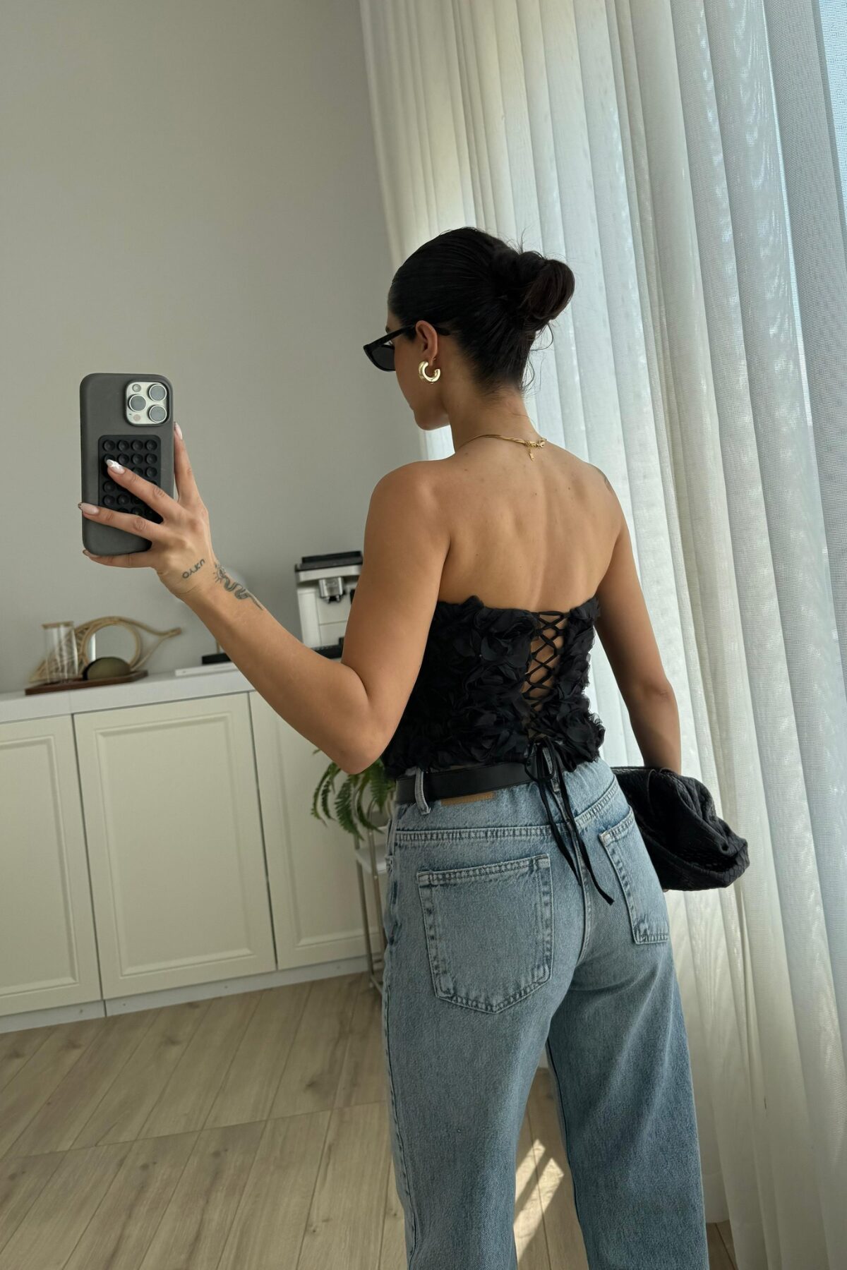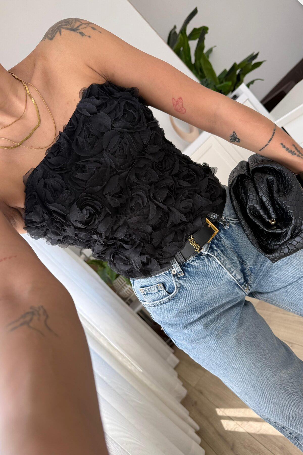 Balenli Güllü Straplez Bluz siyah