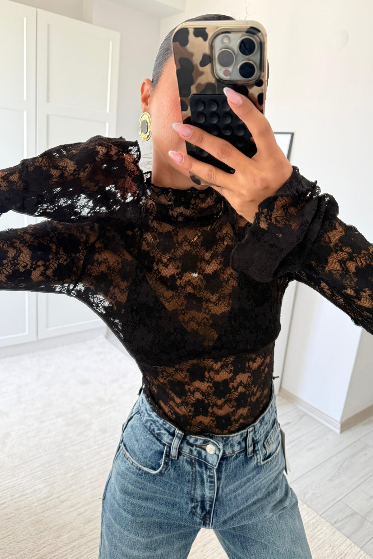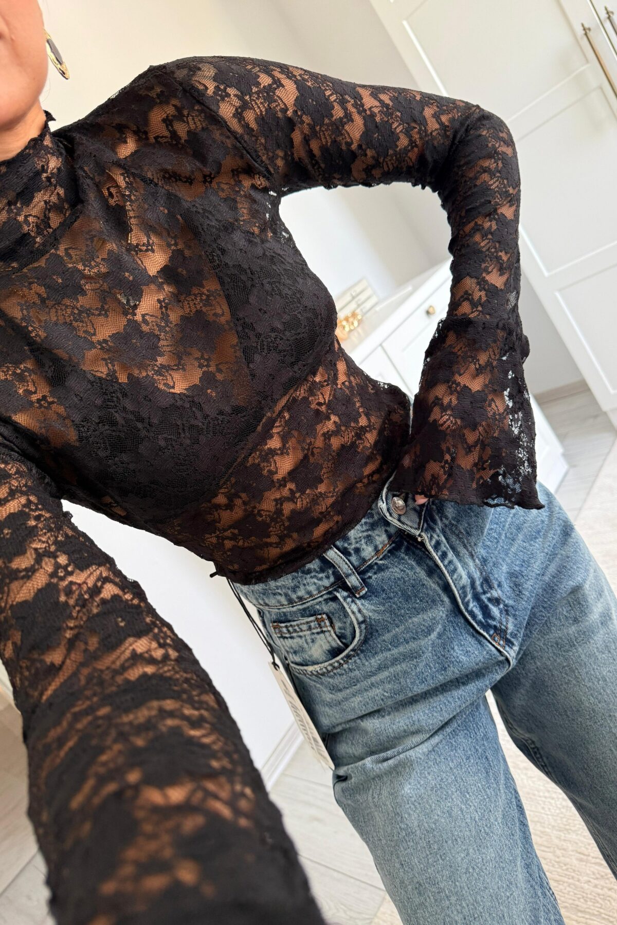 Çiçek Desenli Dantel Bluz Siyah
