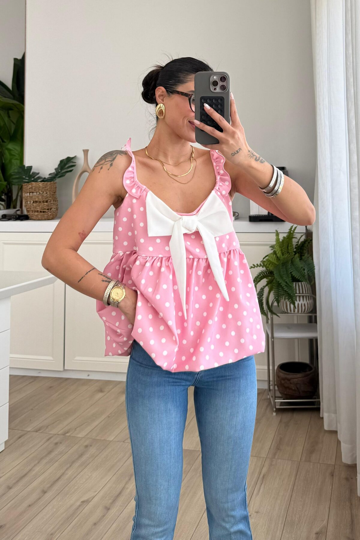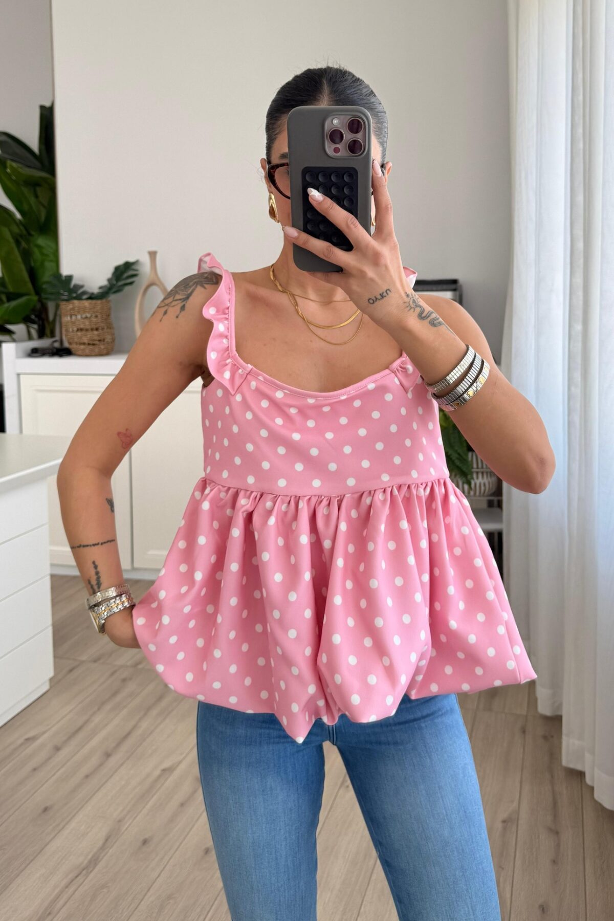 Fiyonk Detaylı Puantiyeli Balon Bluz Pembe
