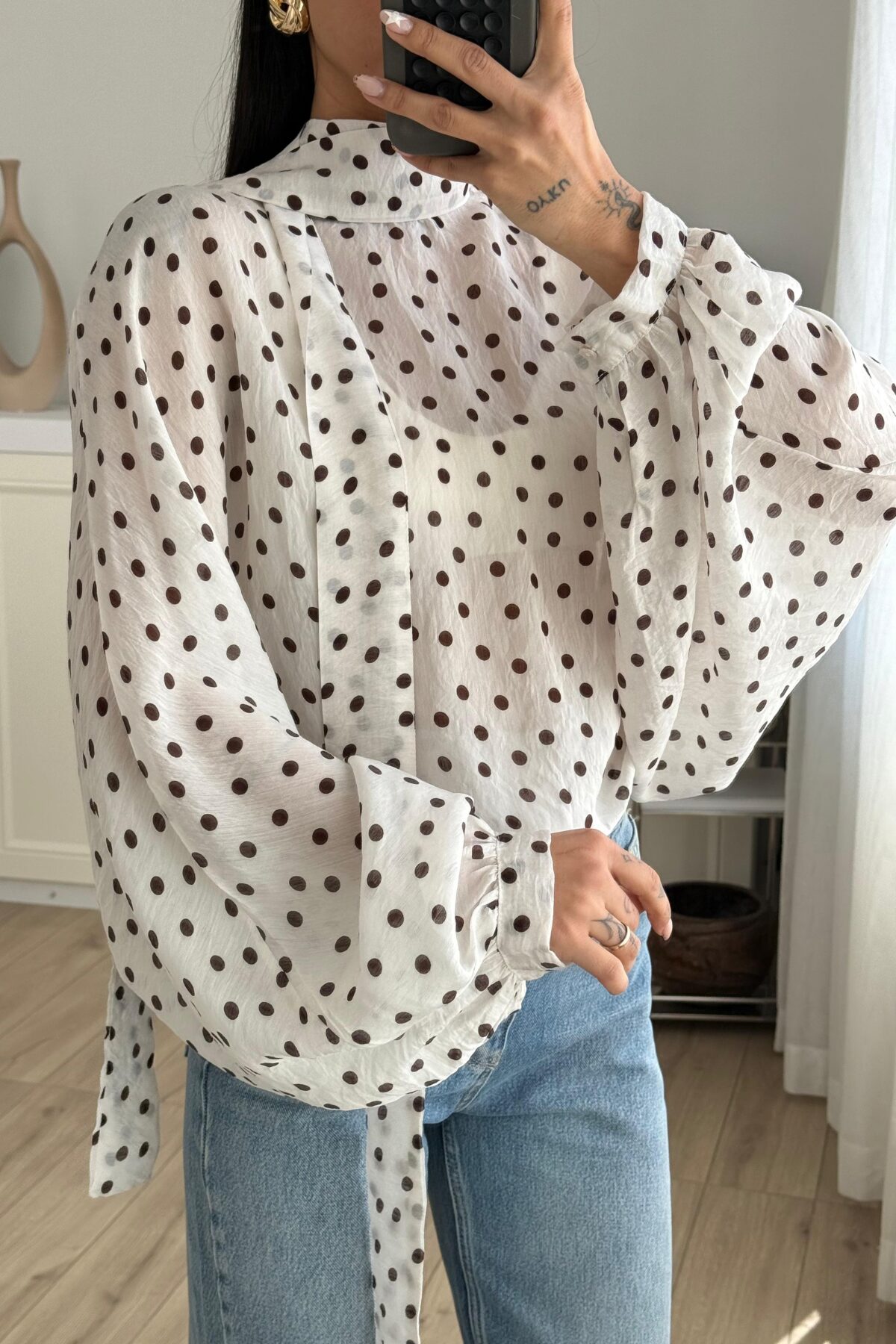 Fularlı Yarasa Kol Puantiyeli Bluz Krem