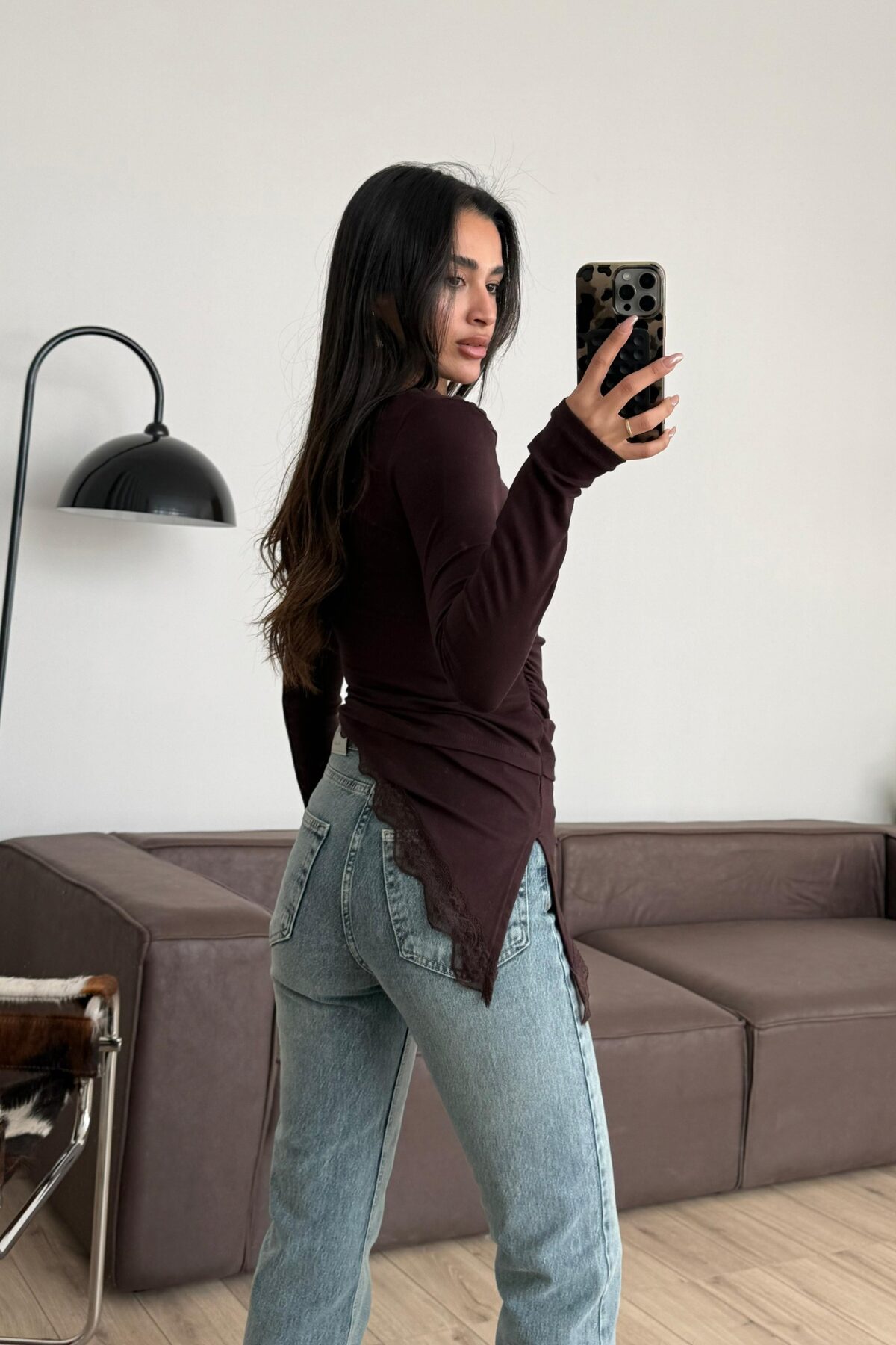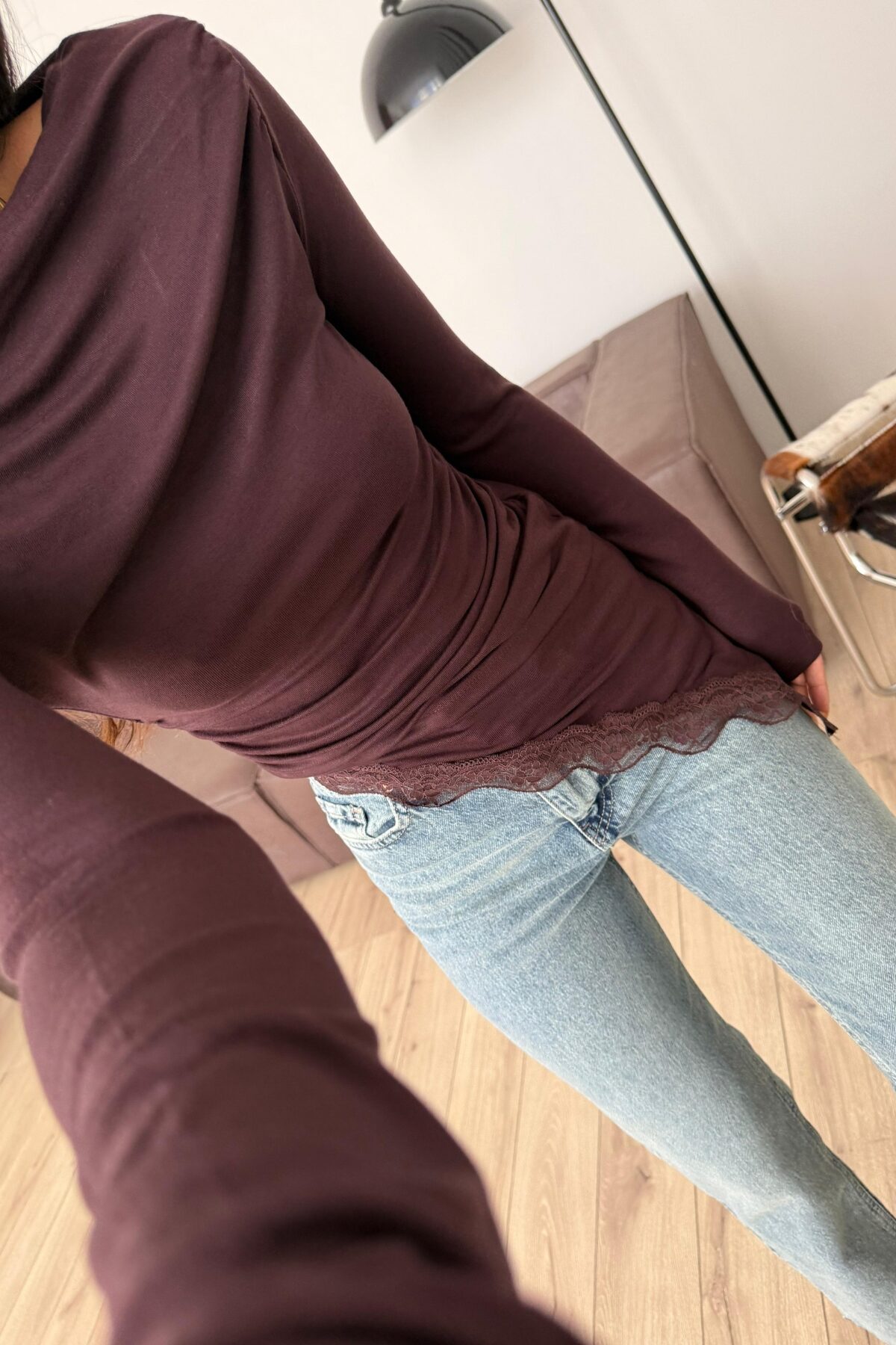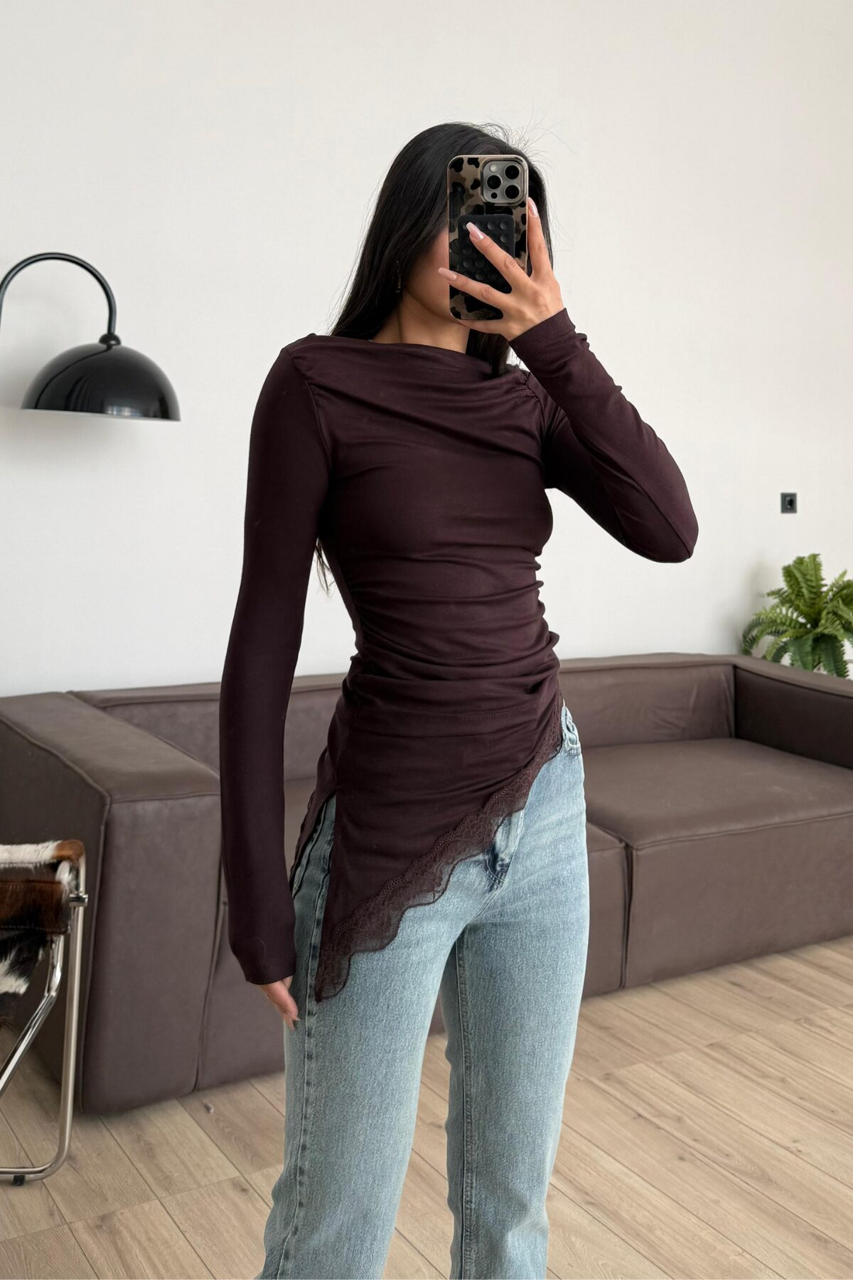 Kayık Yaka Dantel Detaylı Bluz Kahverengi