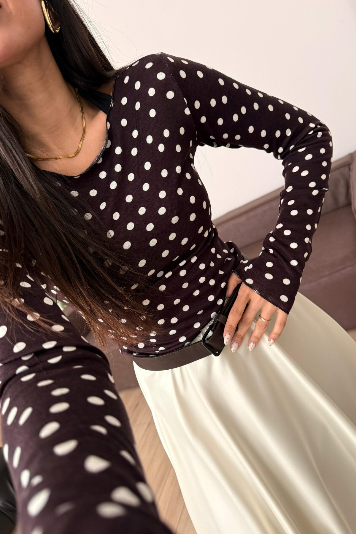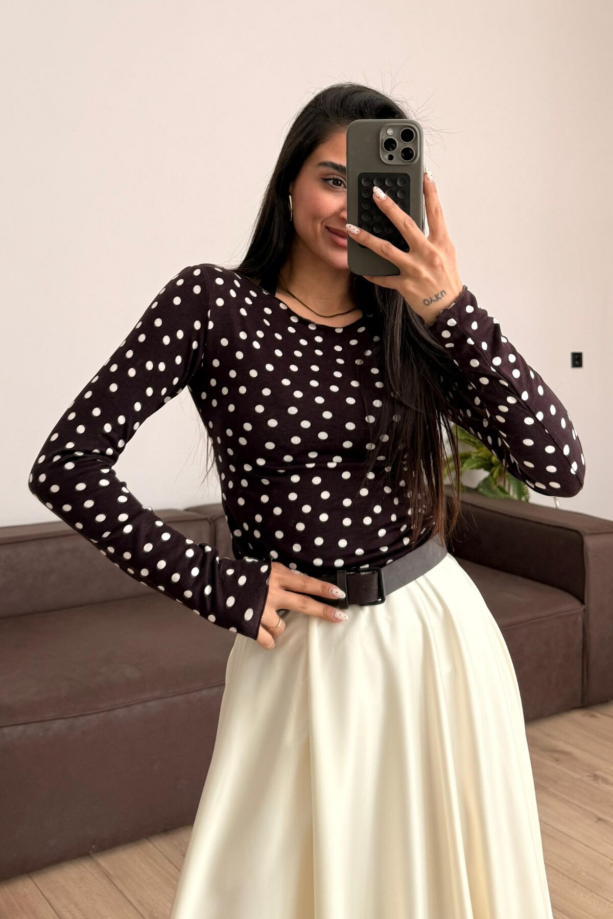 Kayık Yaka Puantiyeli Bluz Acı Kahve