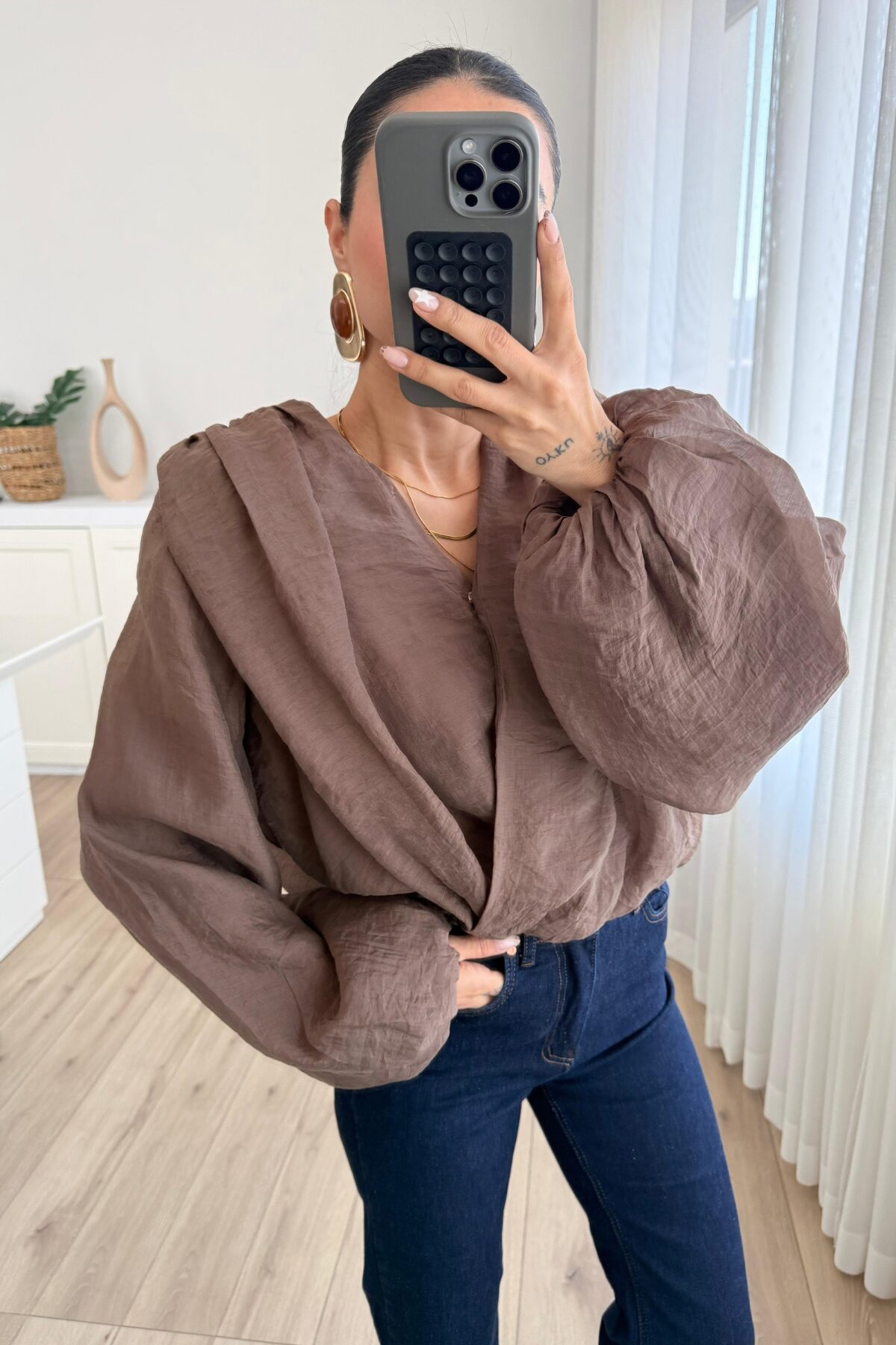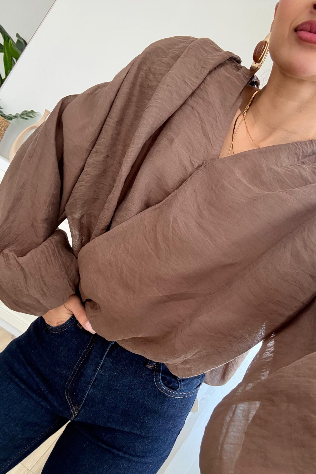 Kruvaze Vatkalı Tül Bluz Kahverengi
