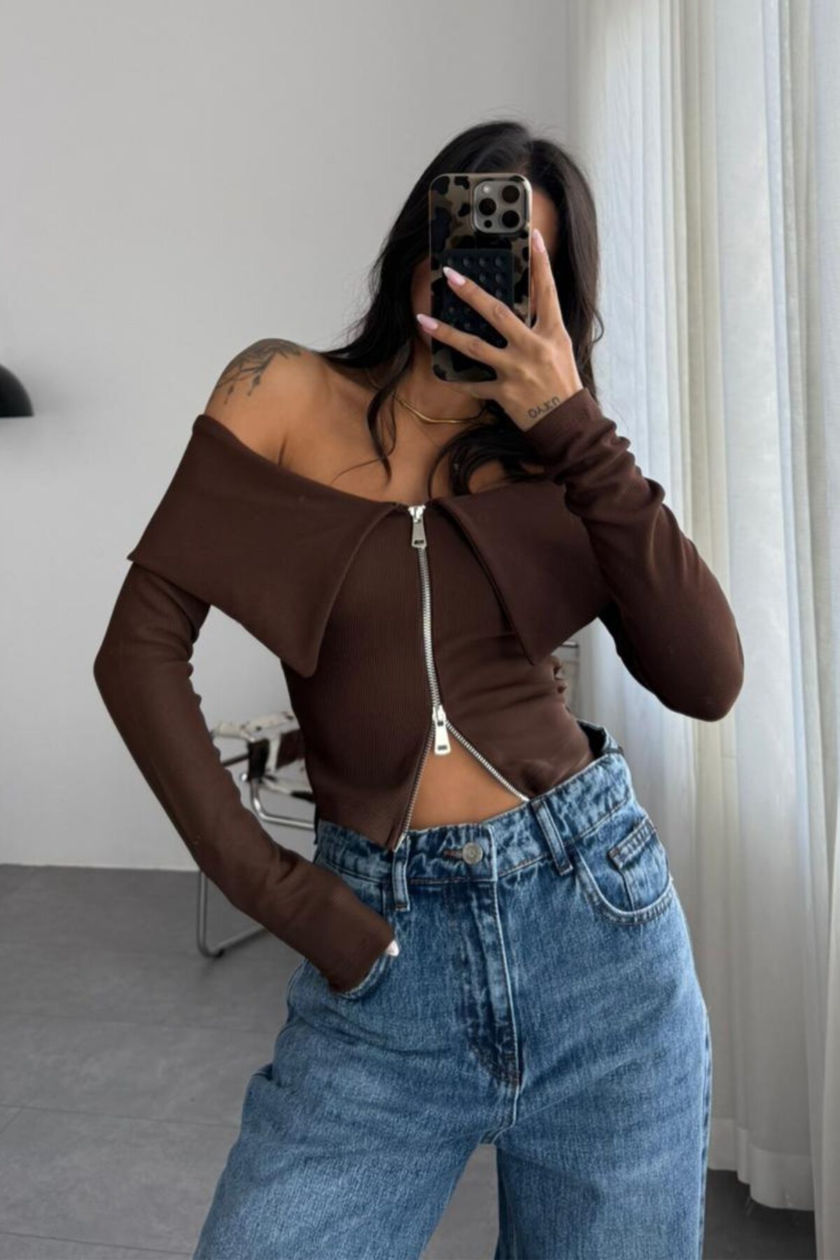 Madonna Yaka Fermuarlı Bluz Kahverengi