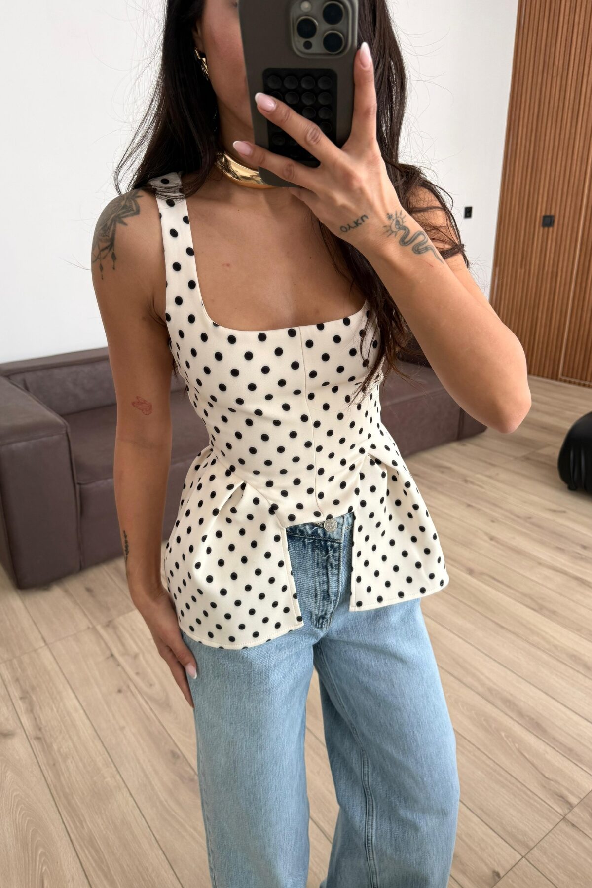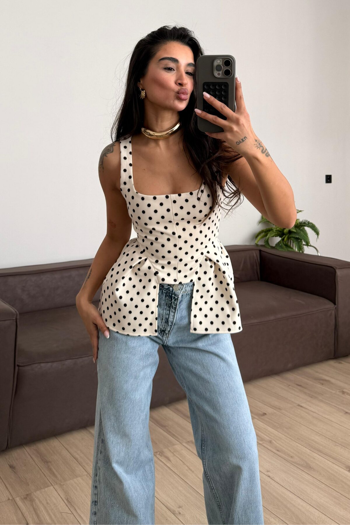 Kare Yaka Puantiyeli Bluz Krem