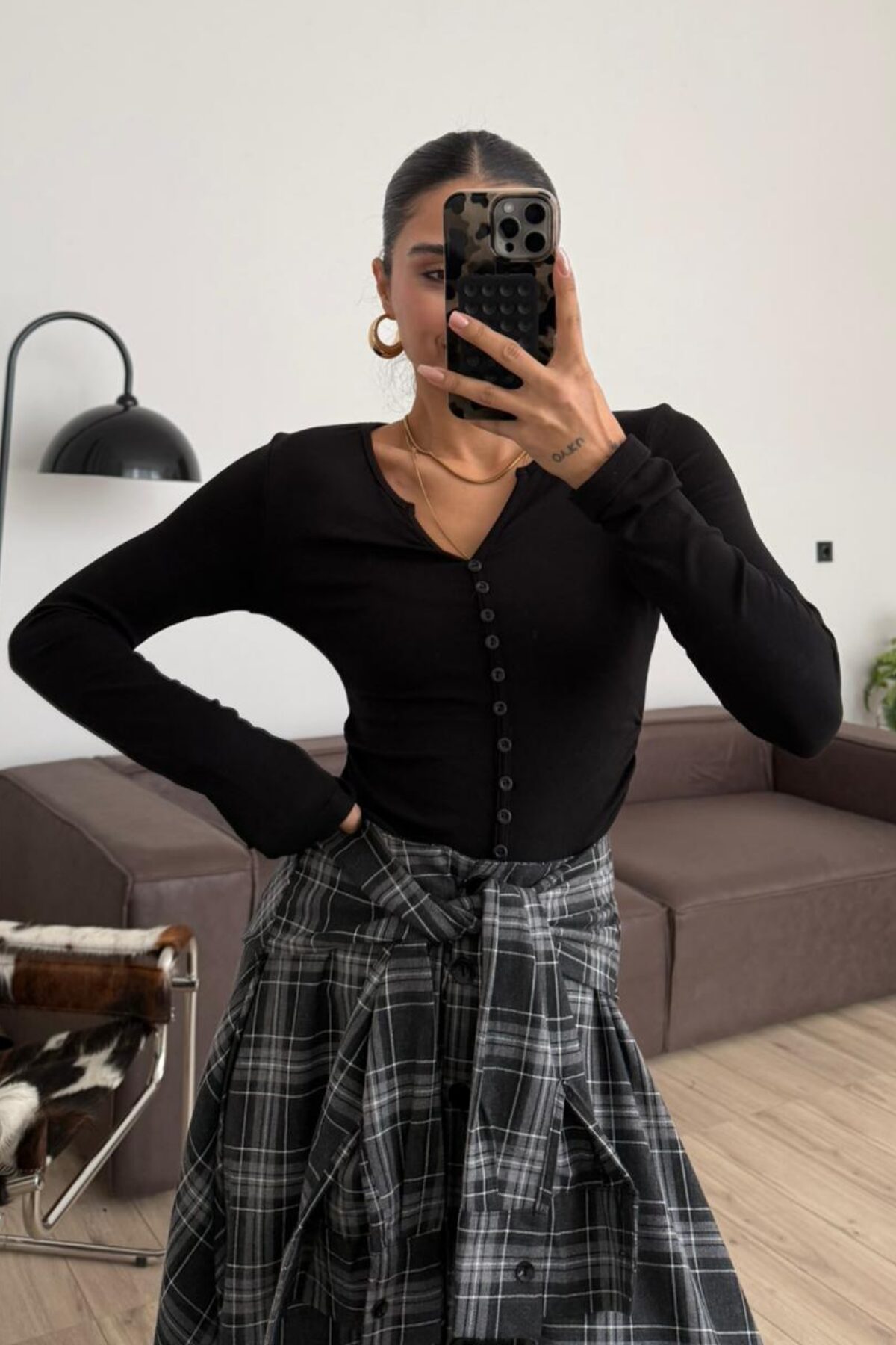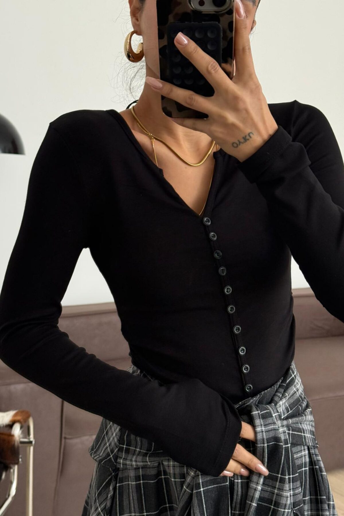 V Yaka Düğmeli Uzun Kollu Bluz Siyah