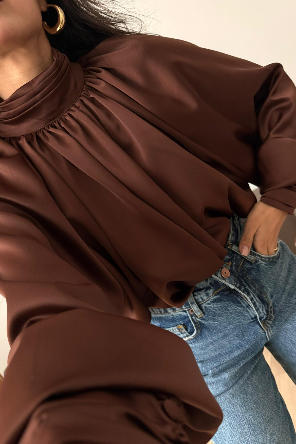 Yakası Pileli Boğazlı Saten Bluz Acı Kahve