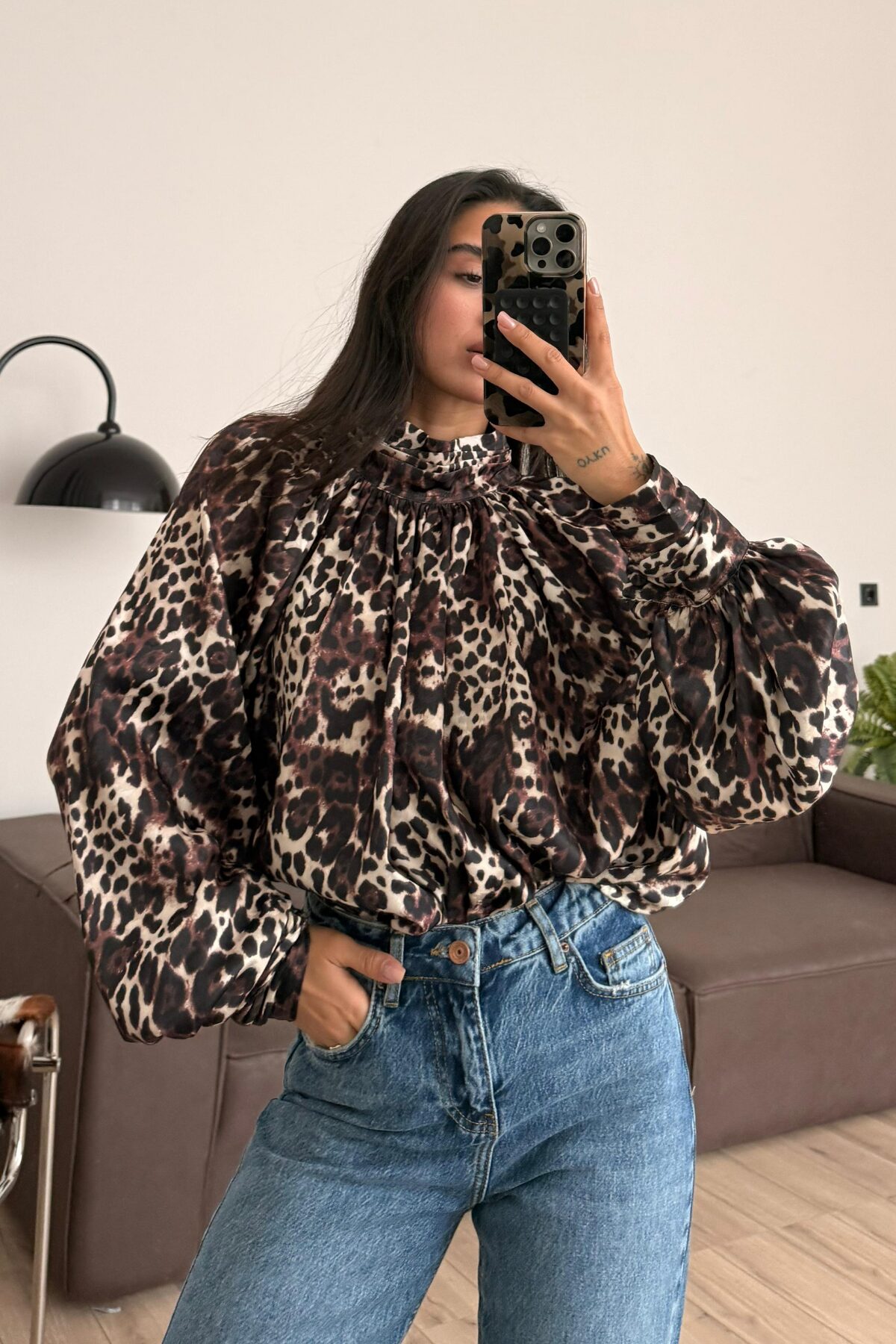 Yakası Pileli Boğazlı Saten Bluz Leopar