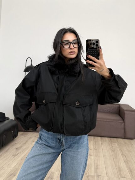Yakası Kürklü Kanguru Cepli Deri Ceket Siyah