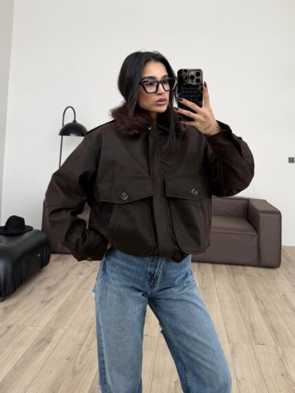 Yakası Kürklü Kanguru Cepli Deri Ceket Acı Kahve