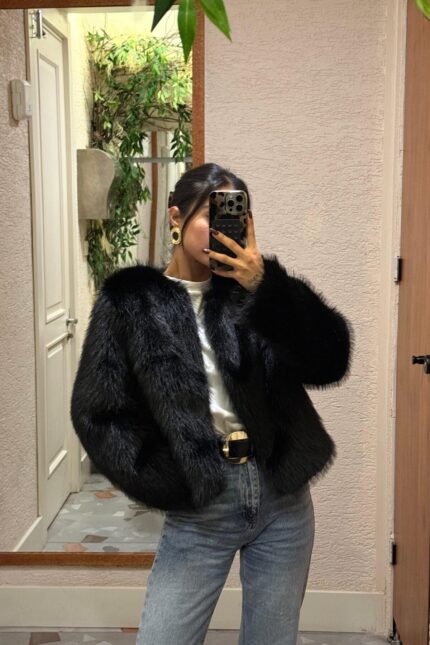 Erus Parlak Tüylü Kürk Ceket Siyah