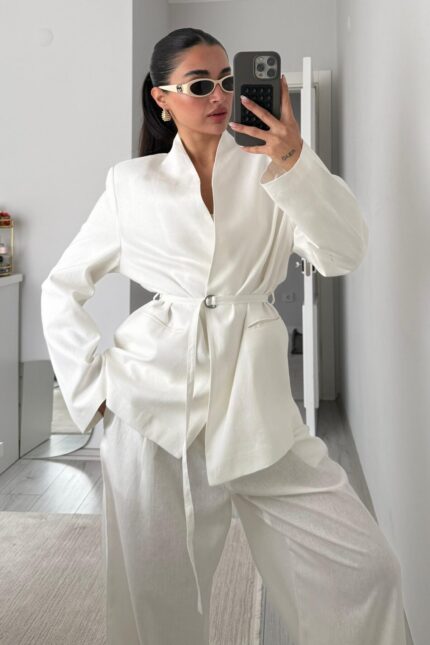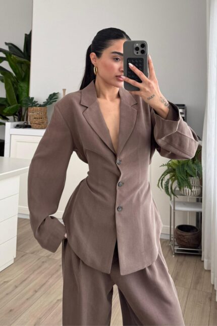 Önü Yırtmaçlı Keten Blazer Ceket Kahverengi