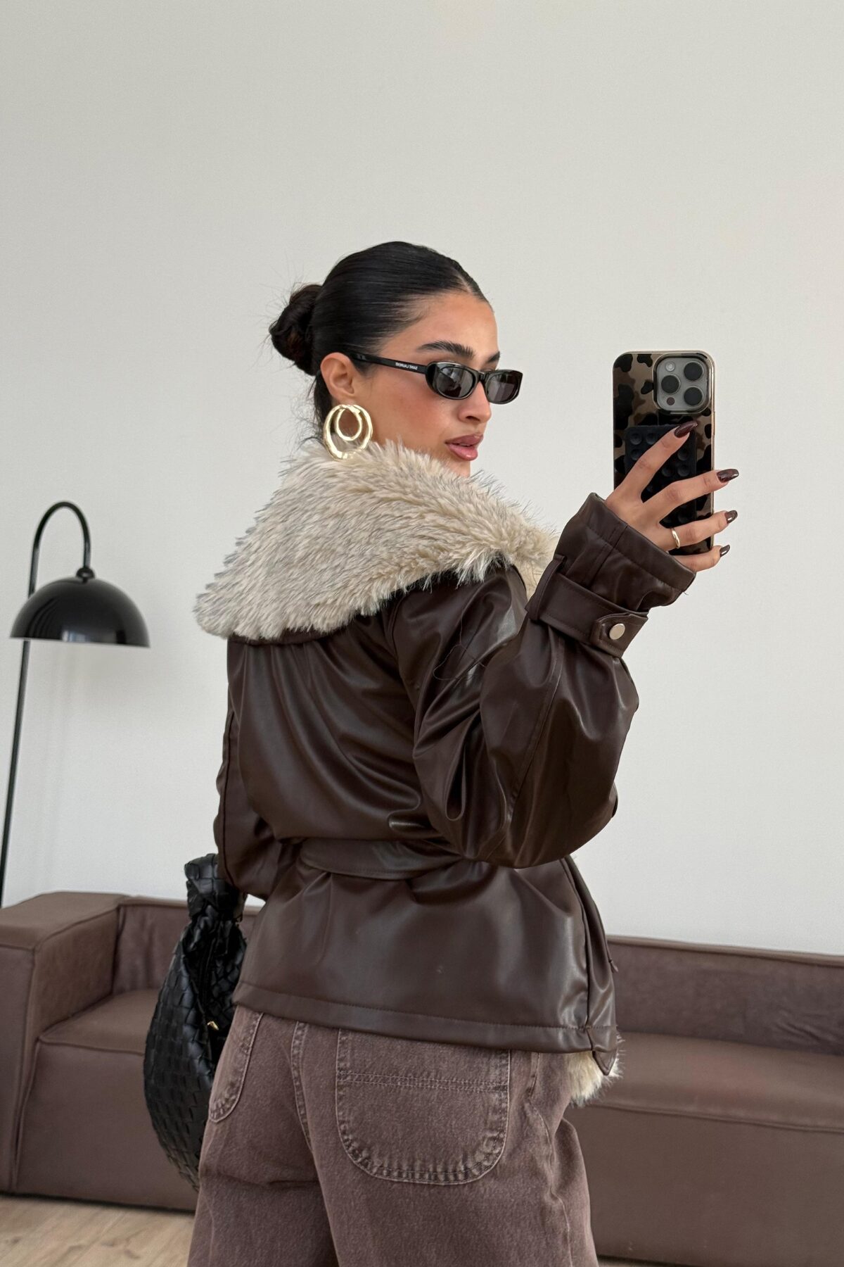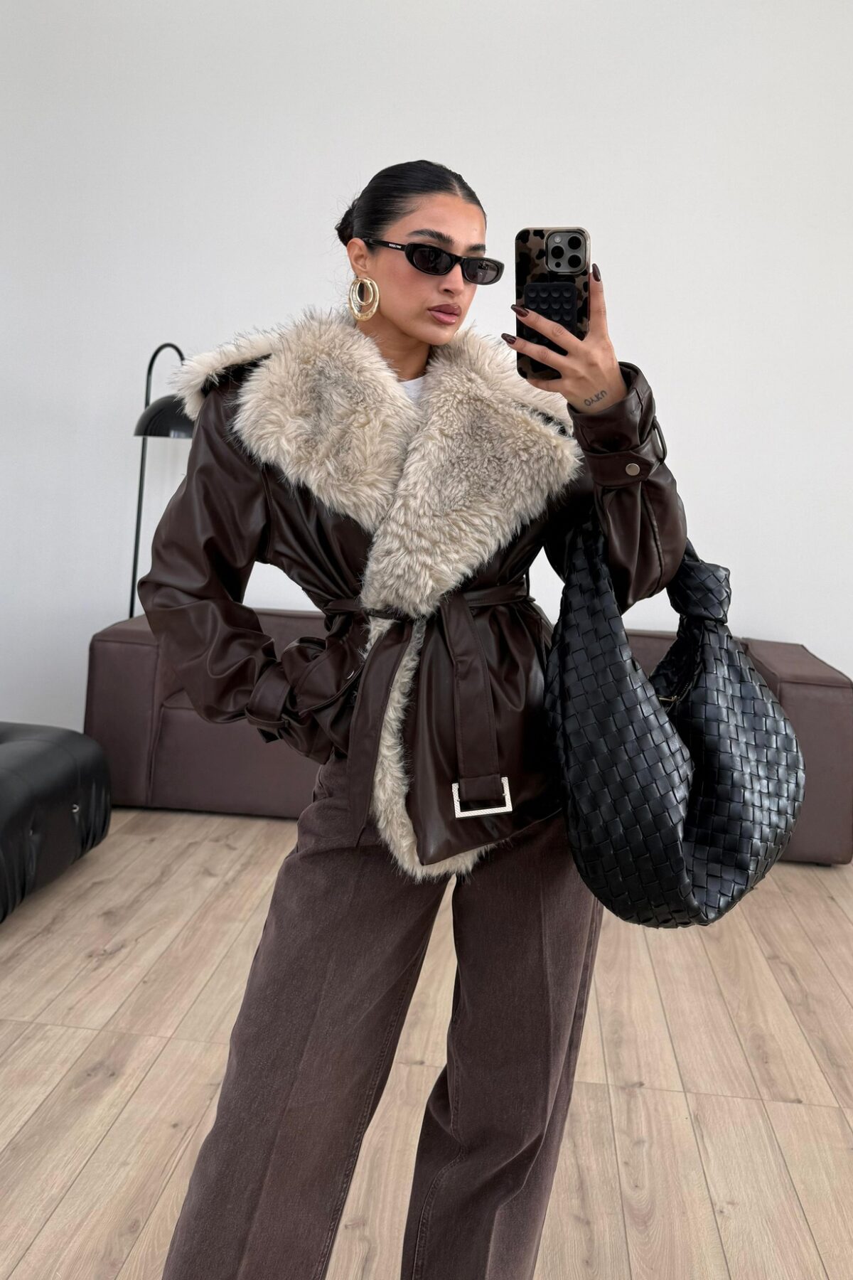 Beli Kemerli Kürk Detaylı Deri Ceket Kahverengi