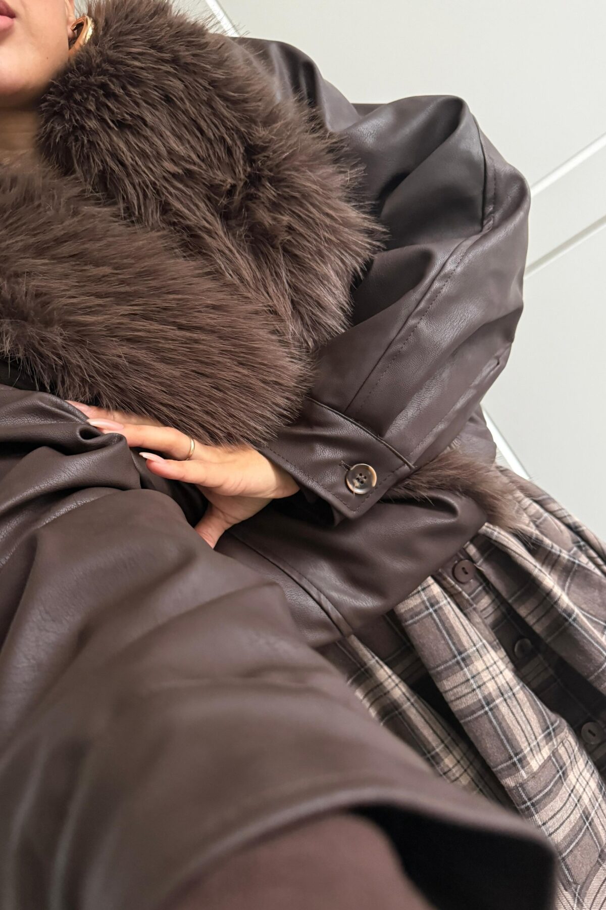 Beli Lastikli Yakası Kürklü Deri Ceket Acı Kahve
